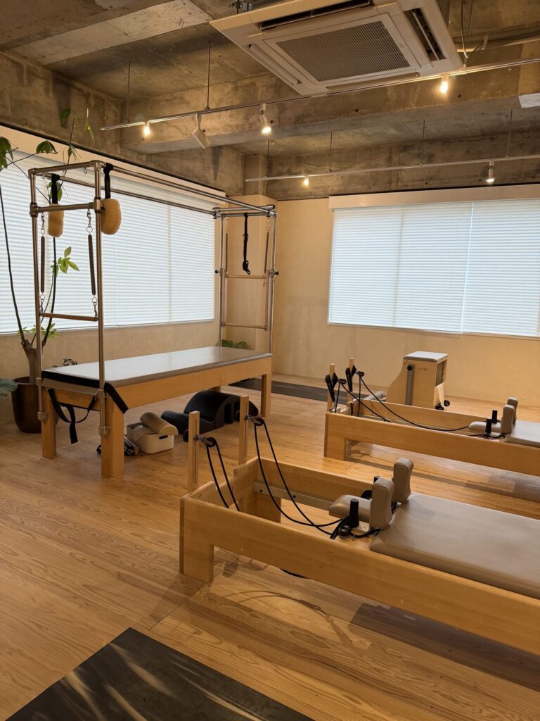 江坂のスタジオは駅近のビル内にあり広いスペースにマットと立派なピラティスマシンが複数設置されており訪問時にも産後ママが赤ちゃんと一緒に利用されていました♪