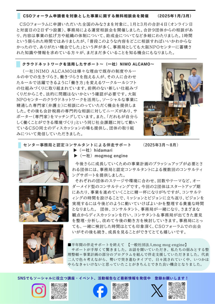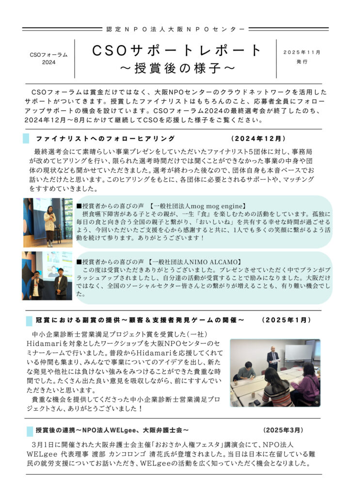 コンテンツ CONTENTS ホーム コンテンツ CSOフォーラム レポート~ 授賞後の様子~ 2025.12.01 CSOフォーラム レポート~ 授賞後の様子~ CSOフォーラム CSOフォーラムは賞金だけではなく、大阪NPOセンターのクラウドネットワークを活用したサポートがついてきます。授賞したファイナリストはもちろんのこと、応募者全員にフォローアップサポートの機会を設けています。CSOフォーラム2024 終了後の12月~今年の8月にかけて継続してCSOを応援した様子をご覧ください。2025年のサポートの様子については、今後発信していく予定です。 一覧へ戻る