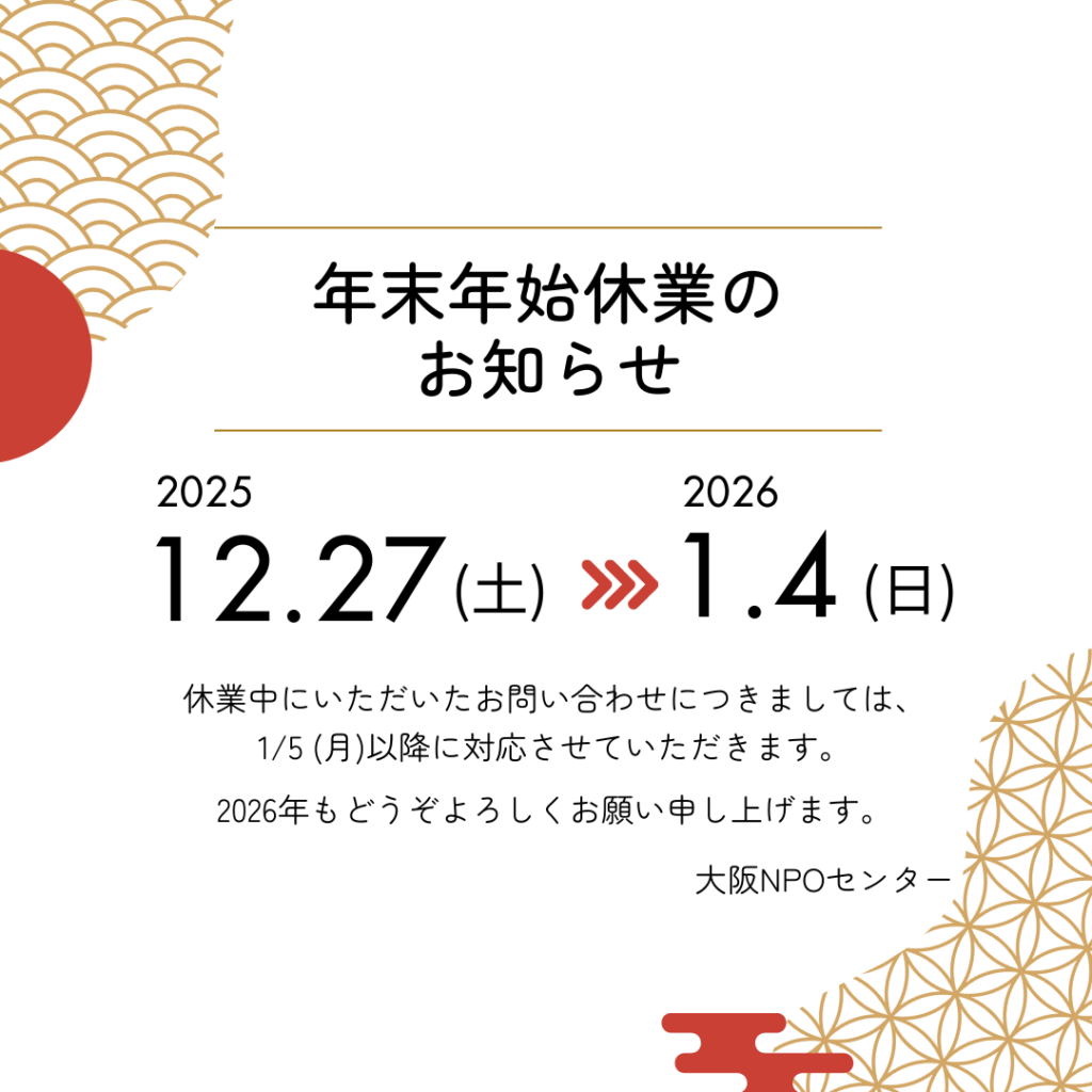 コンテンツ CONTENTS ホーム コンテンツ 年末年始休業のお知らせ 2025.12.01 年末年始休業のお知らせ センター情報 平素は格別のご高配を賜り、誠にありがとうございます。年末年始の休業期間について、以下の通りお知らせいたします。ご不便をおかけいたしますが、何卒ご理解いただけますようお願いいたします。2026年もどうぞよろしくお願い申し上げます。 〔年末年始の休業期間〕2025年12月27日(土)~ 2026年1月4日(日) ※期間中はセミナースペースの貸出も休業になります。※期間中にいただきましたご連絡につきましては、1月5日(月)以降に順次対応させていただきます。 一覧へ戻る
